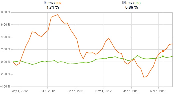 Historicky sa väčšina zahraničného obchodu s Čínou realizovala v USD. Čínsky renminbi je aj oficiálne naviazaný na dolár a čínska národná banka udržuje jeho kurz stanovenom pásme +/- 1% (viď graf nižšie).